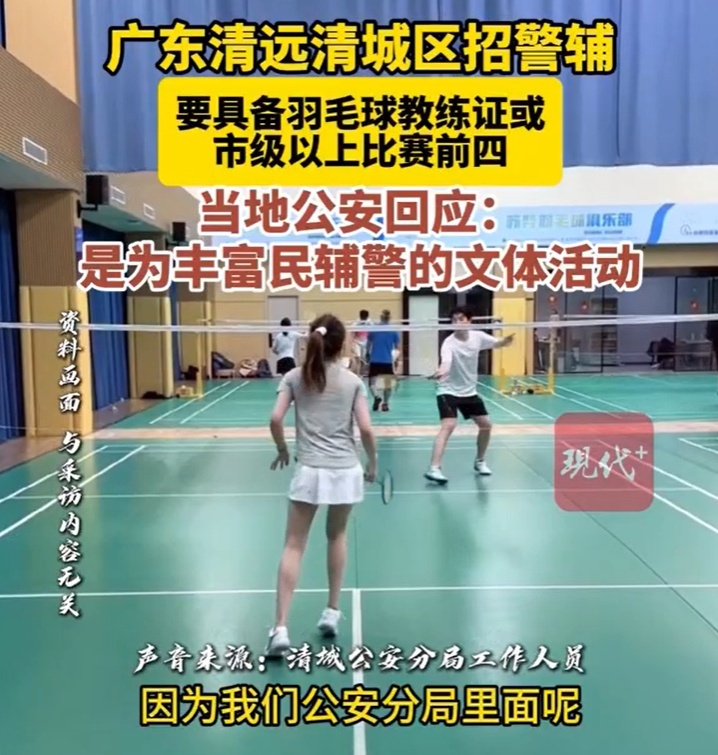 2月14日,清城公安分局相关部门向现代快报记者回应称,工会在组建羽毛球队,想招一名有羽毛球特长的女性辅警,还能当教练培训其他女性工会会员。